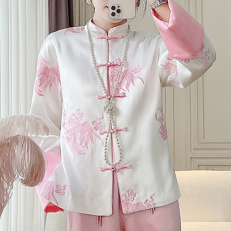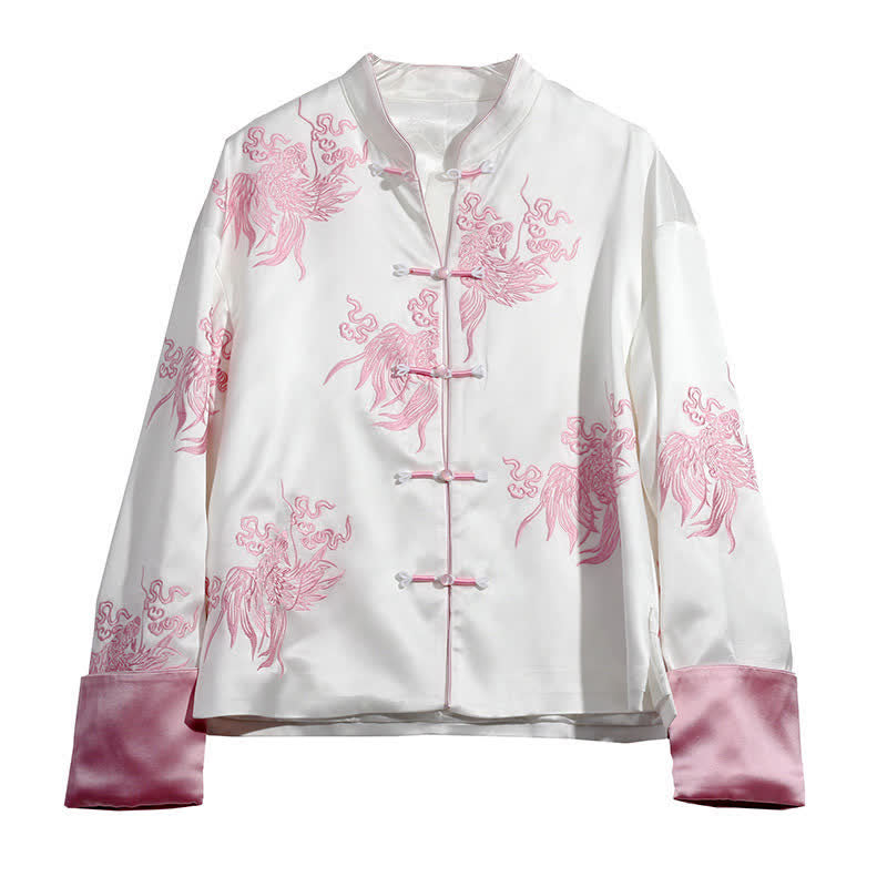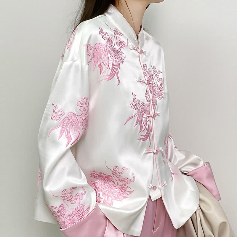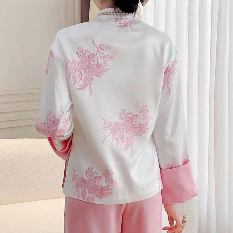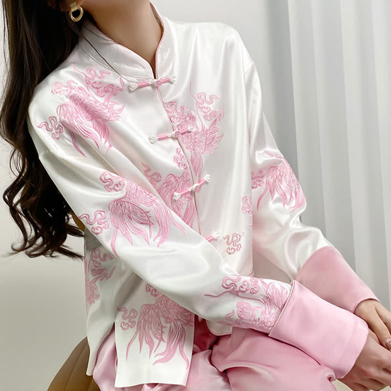 Vintage Floral Embroidery Buckle Long Sleeve Satin Shirt