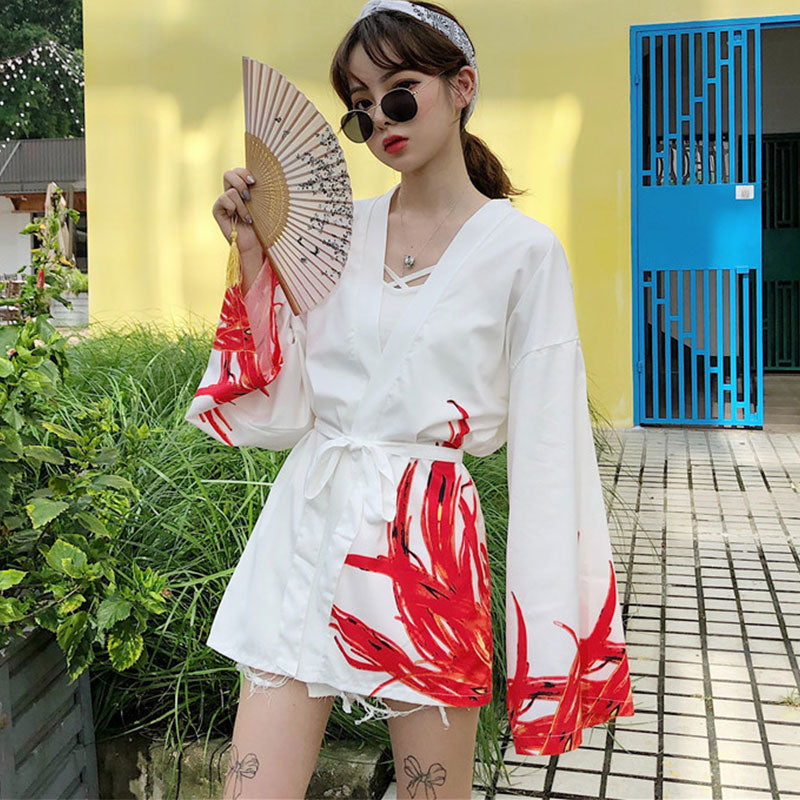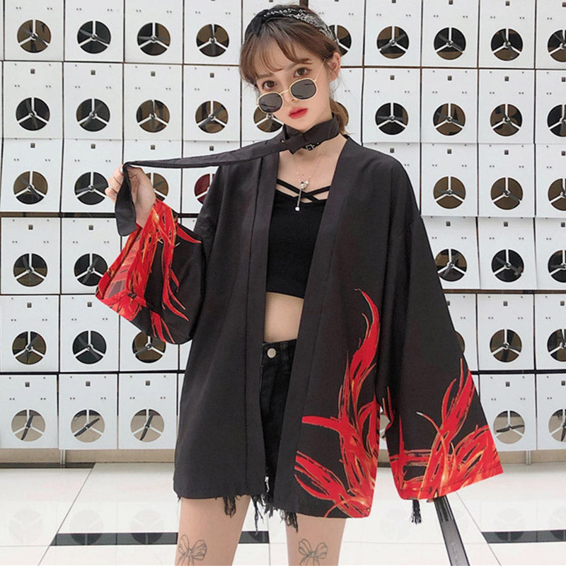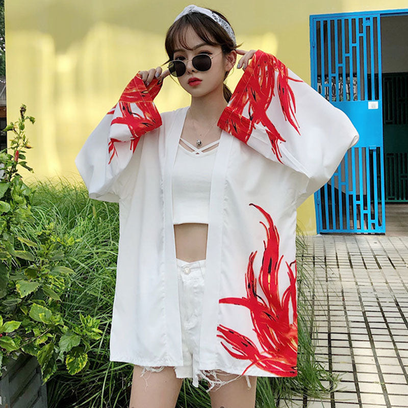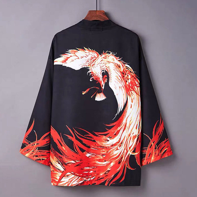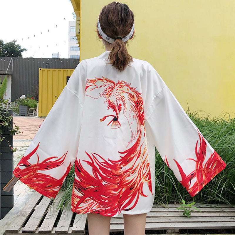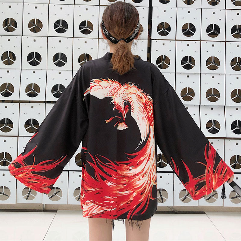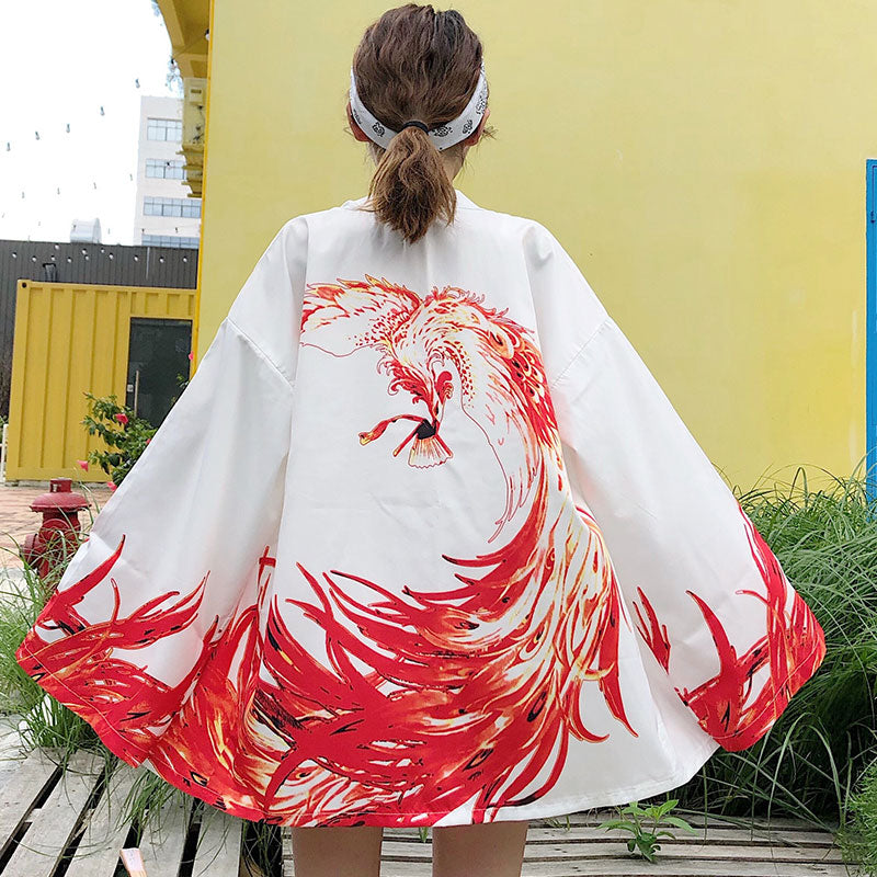 Wrap yourself in elegance with our Vivid Phoenix Print Kimono Outerwear. Featuring a stunning phoenix print, this kimono not only adds style to your look but also provides sun protection. Stay stylish and safe from the sun with this elegant outerwear.