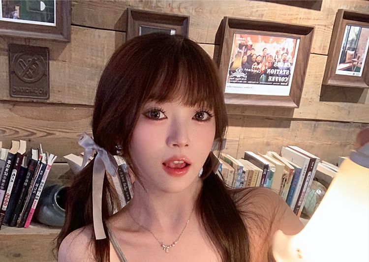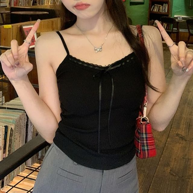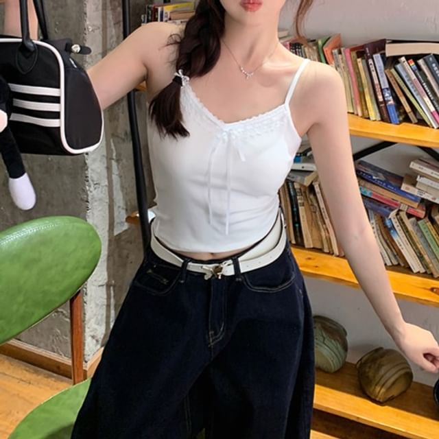 V-Neck Plain Bow Accent Lace Trim Crop Cami Top